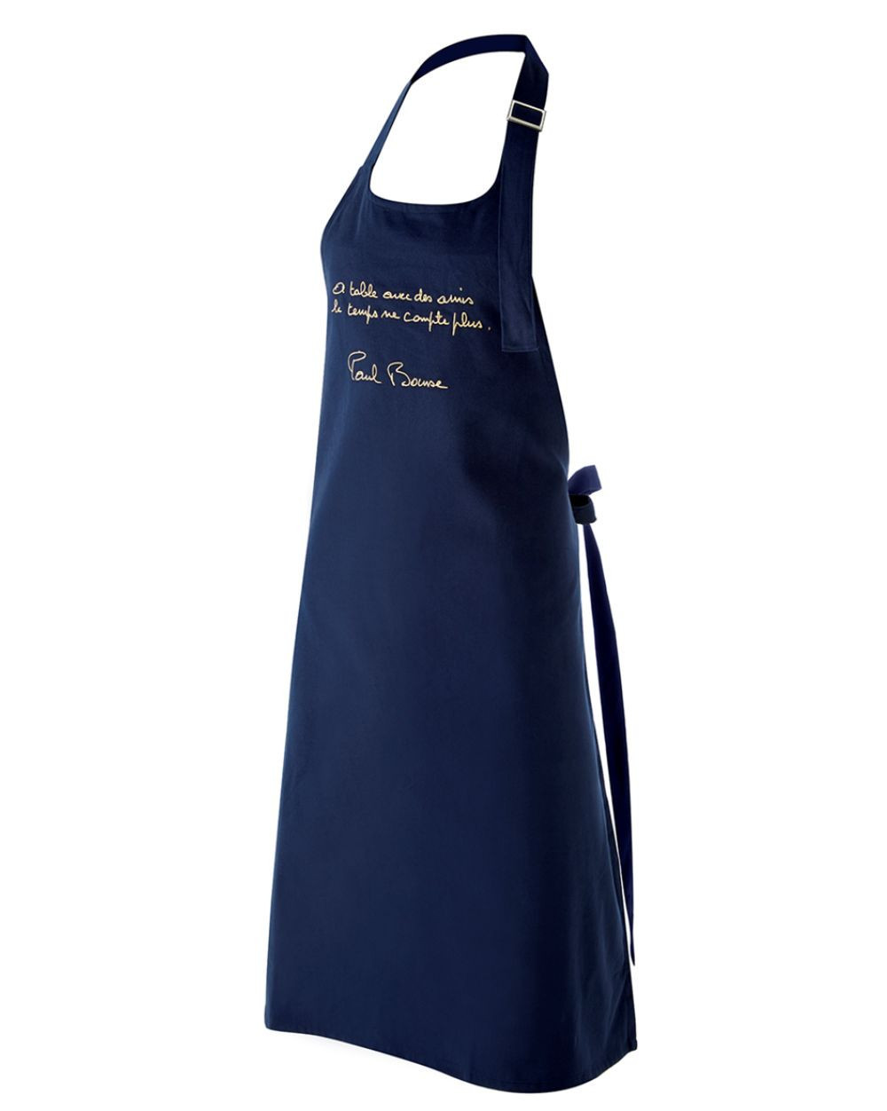 Mettez-vous dans la peau d’un Chef en enfilant ce tablier bleu pour cuisiner vos mets préférés ou surprenez vos proches en leur offrant une véritable tenue brodée au fil doré d’une des citations les plus cultes de Monsieur Paul : “A table avec des amis, le temps ne compte plus”.